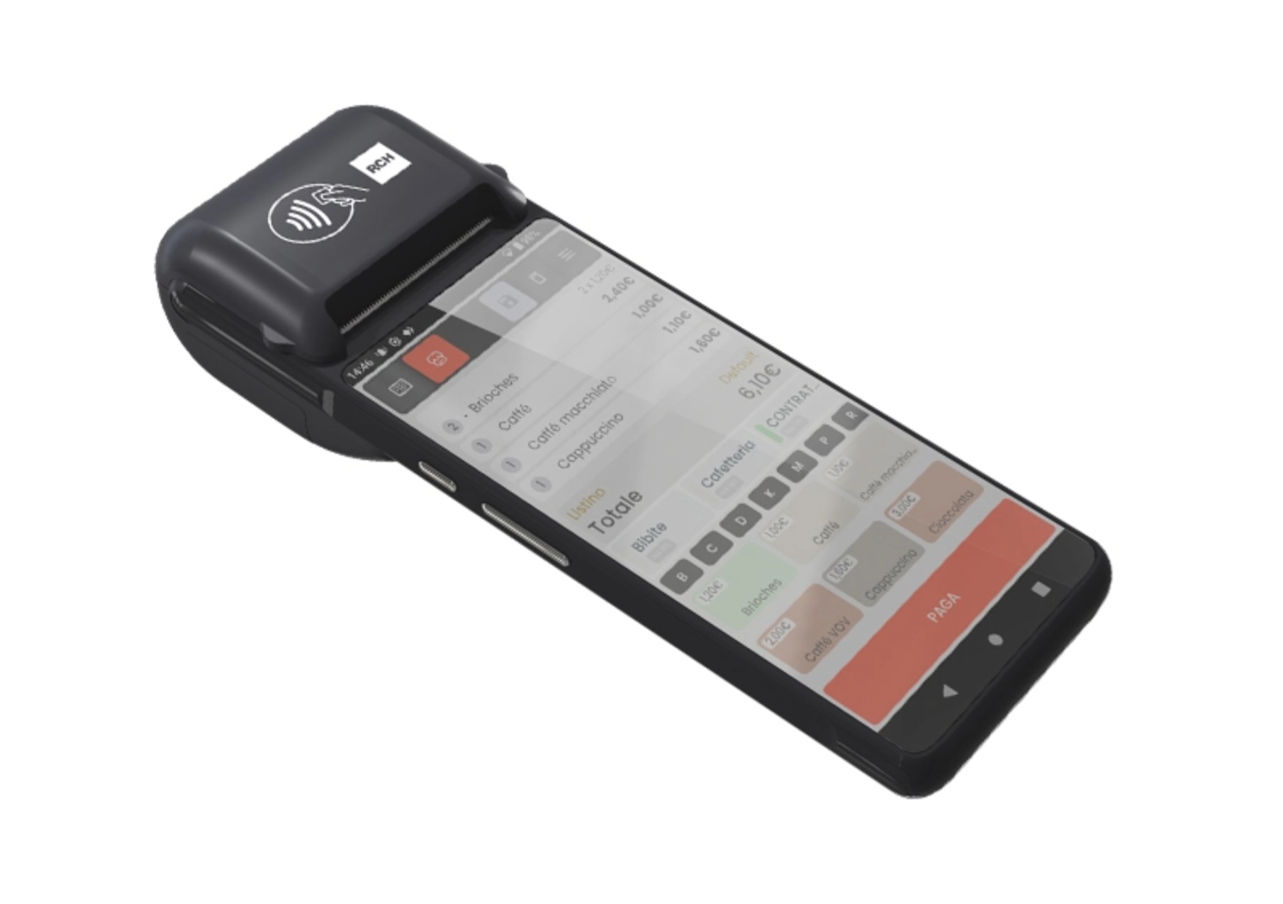 Il dispositivo integra la funzione di incasso digitale grazie alla compatibilità con RCH Pay SoftPOS, consentendo di accettare pagamenti elettronici direttamente dal registratore telematico. È sufficiente inserire l'importo e avvicinare la carta del cliente per completare la transazione, eliminando la necessità di POS esterni e semplificando la gestione del punto cassa.